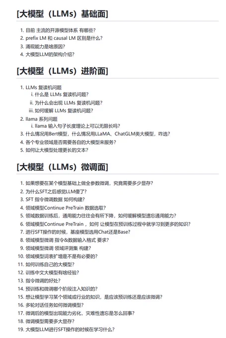 这是一份关于大模型(LLMs)学习清单的截图,非常详细地列举了大模型相关的学习路径,包括基础面、进阶面、微调面和开发面等内容,非常适合用于构建大模型的知识架构,大家可以根据路径进行自主学习
